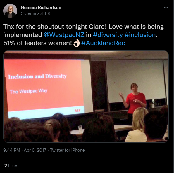 @WestpacNZ in #diversity #inclusion. 51% of leaders women!👌🏻#AucklandRec”