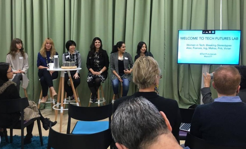 A panel featuring women of all different ages, backgrounds and ethnicities had gathered in the inspire room at Tech Futures Lab to chew over some meaty problems. There was founder Frances Valintine, computer engineer and She# founder Mahsa Mohaghegh, #everydaysexism and IT expert Vivian Chandra, The Next Billion’s Priti Ambani, software engineer Nitkalya Wiriyanuparb and data architect Alex Garkavenko – which is a job that exists because we live in The Matrix BTW.