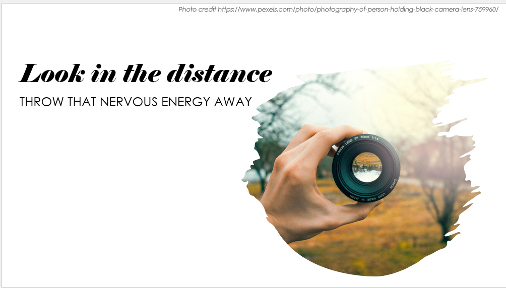 I saw this tip online somewhere a while ago, and I really loved it. The idea is that you will have nervous energy, and pretending you do not is lying to yourself. So instead of pretending you don’t have nervous energy, pick a far-off, unimportant point in the back of the room, and throw your nervous, anxious energy there – don’t try to ignore that you have it, just throw it away!